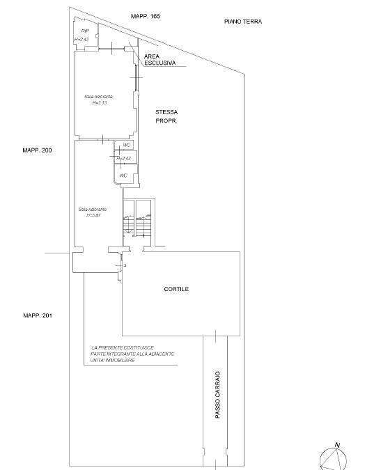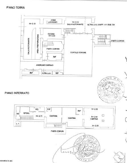 Immobile frutto di una attuale ristrutturazione gode di due sale da pranzo, una terza sala da pranzo riservata e dehor, servizi igienici, cucina atterzzata, zona tecnica per il lavaggio stoviglie, ampio bancone per la gestione dell’attività di ristorazione, collega la scala interna al piano interrato locali adibiti a spogliatoi per i dipendenti con altri servizi igienici, due ampie cantine adibite al deposito dei generi alimentari con relative celle frigo.
